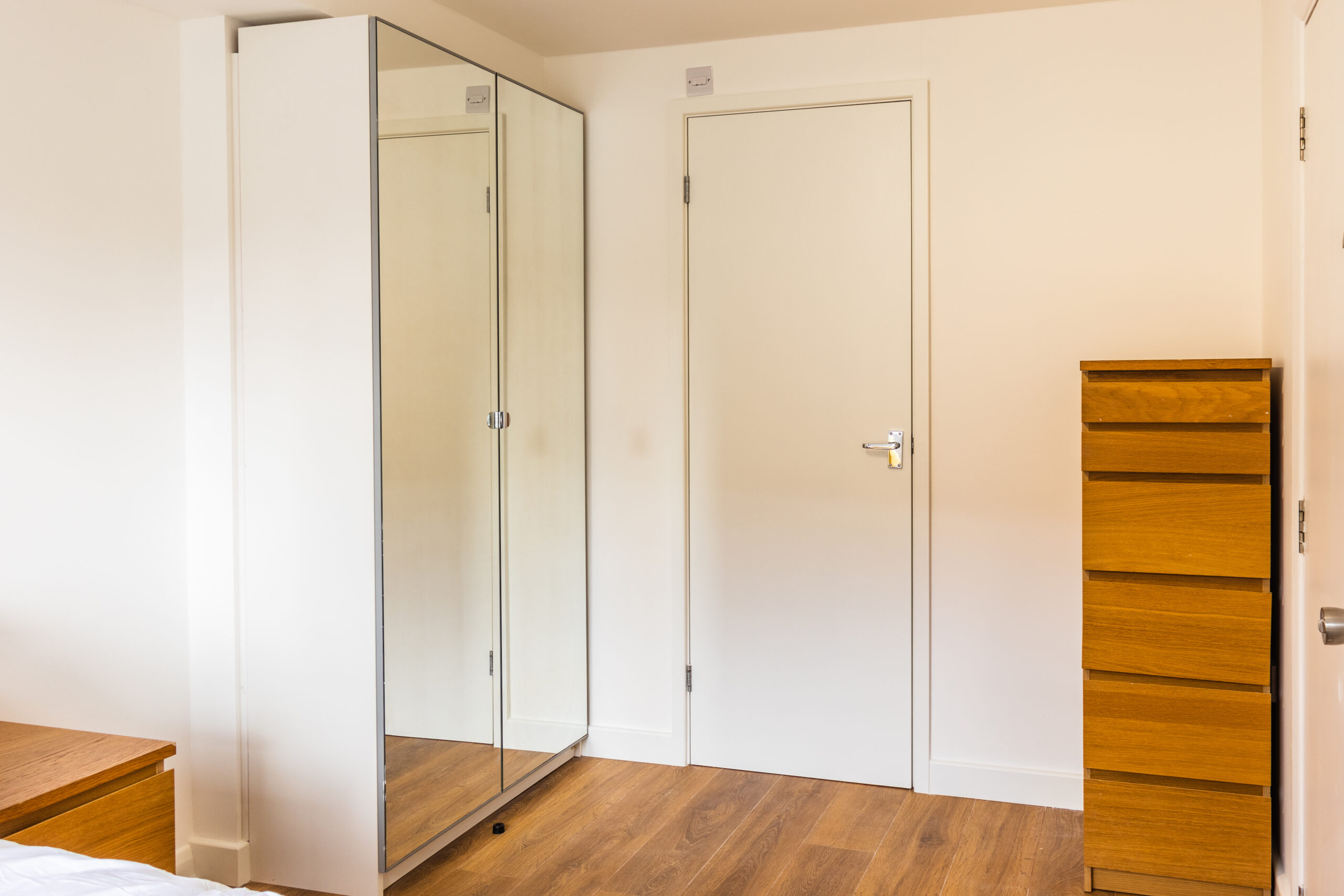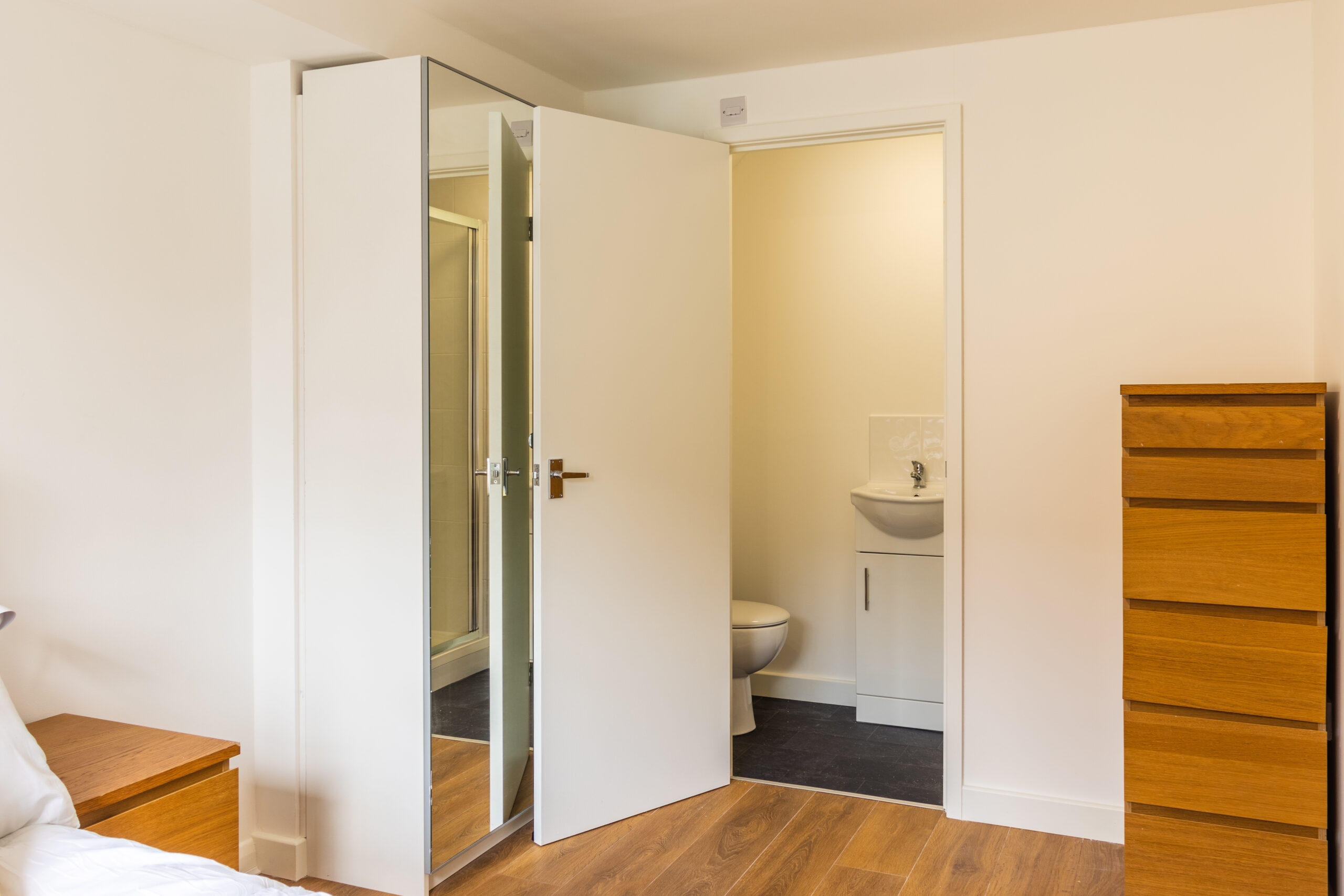 Ground Floor ensuite with its own sink, shower and toilet. The room has a double bed, 2x mirrored wardrobes, chest of drawers and also a bedside table.